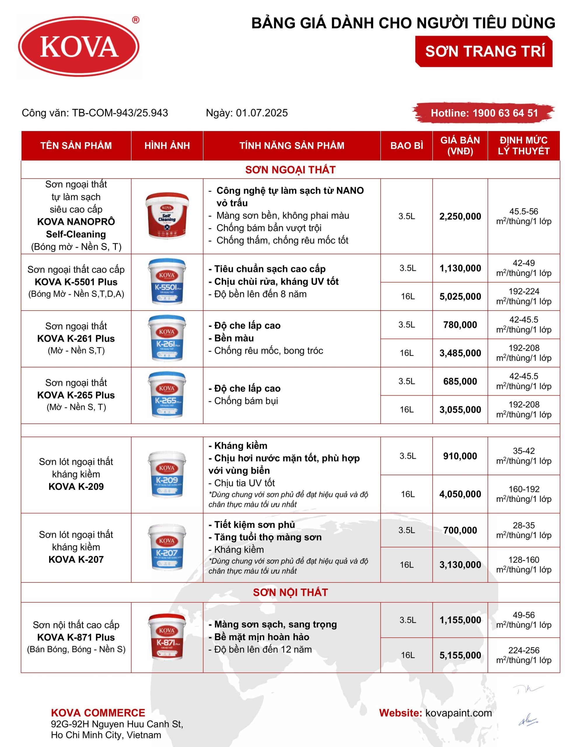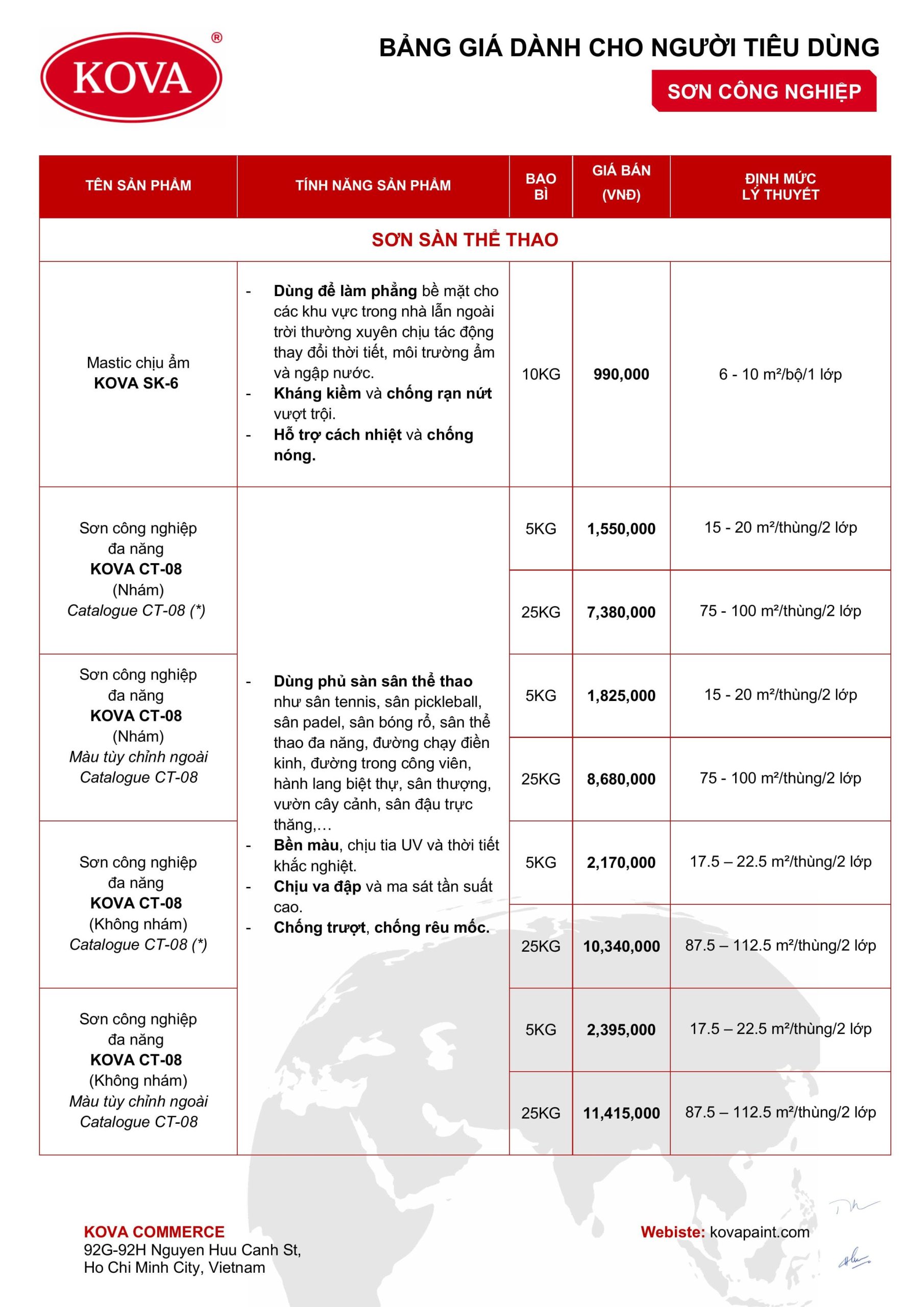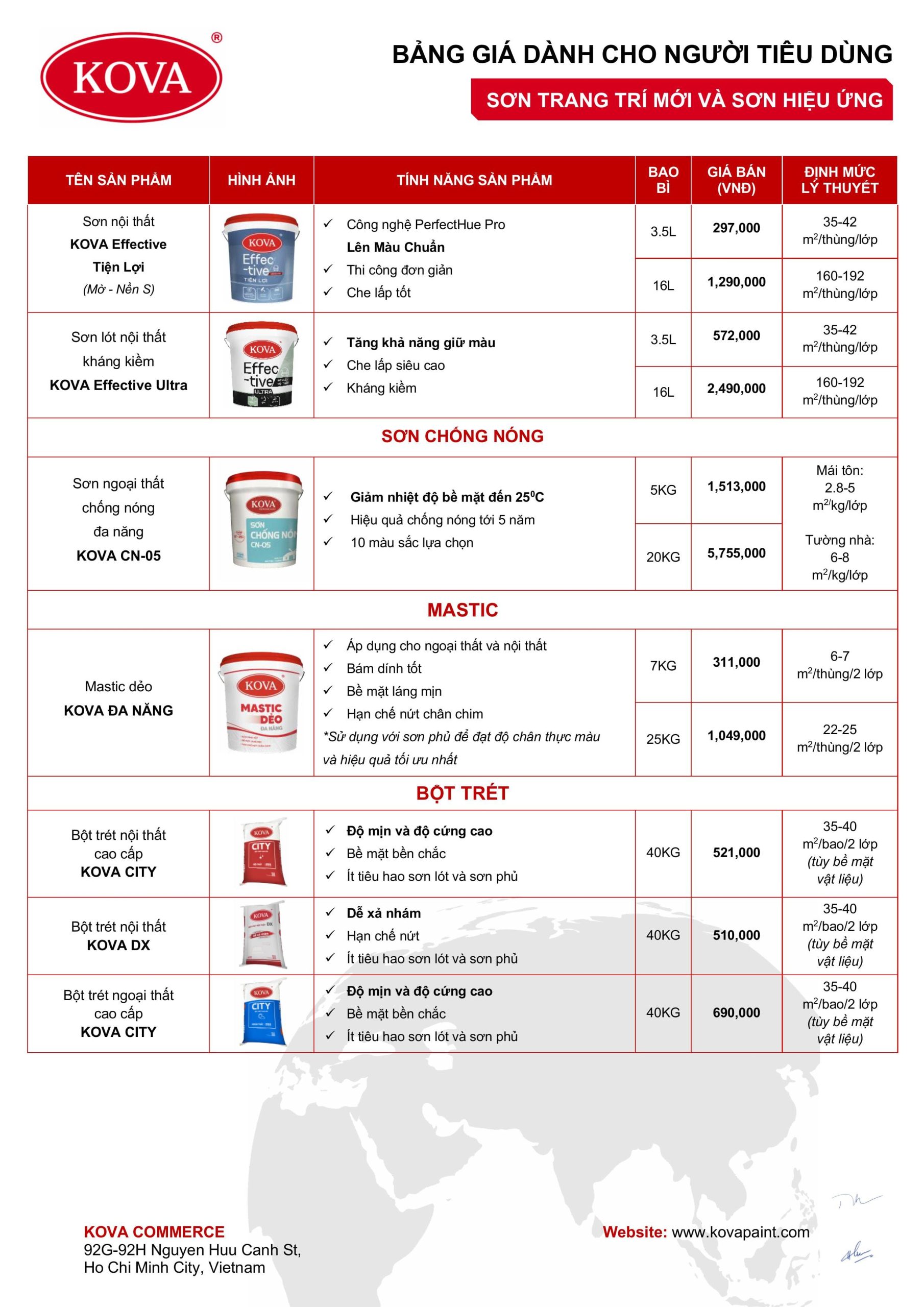 Lưu ý: Bảng giá trên là từ công ty KOVA (Có hiệu lực từ 01/07/2025), giá sản phẩm có thể thay đổi tùy theo chiết khấu đại lý và thời điểm.