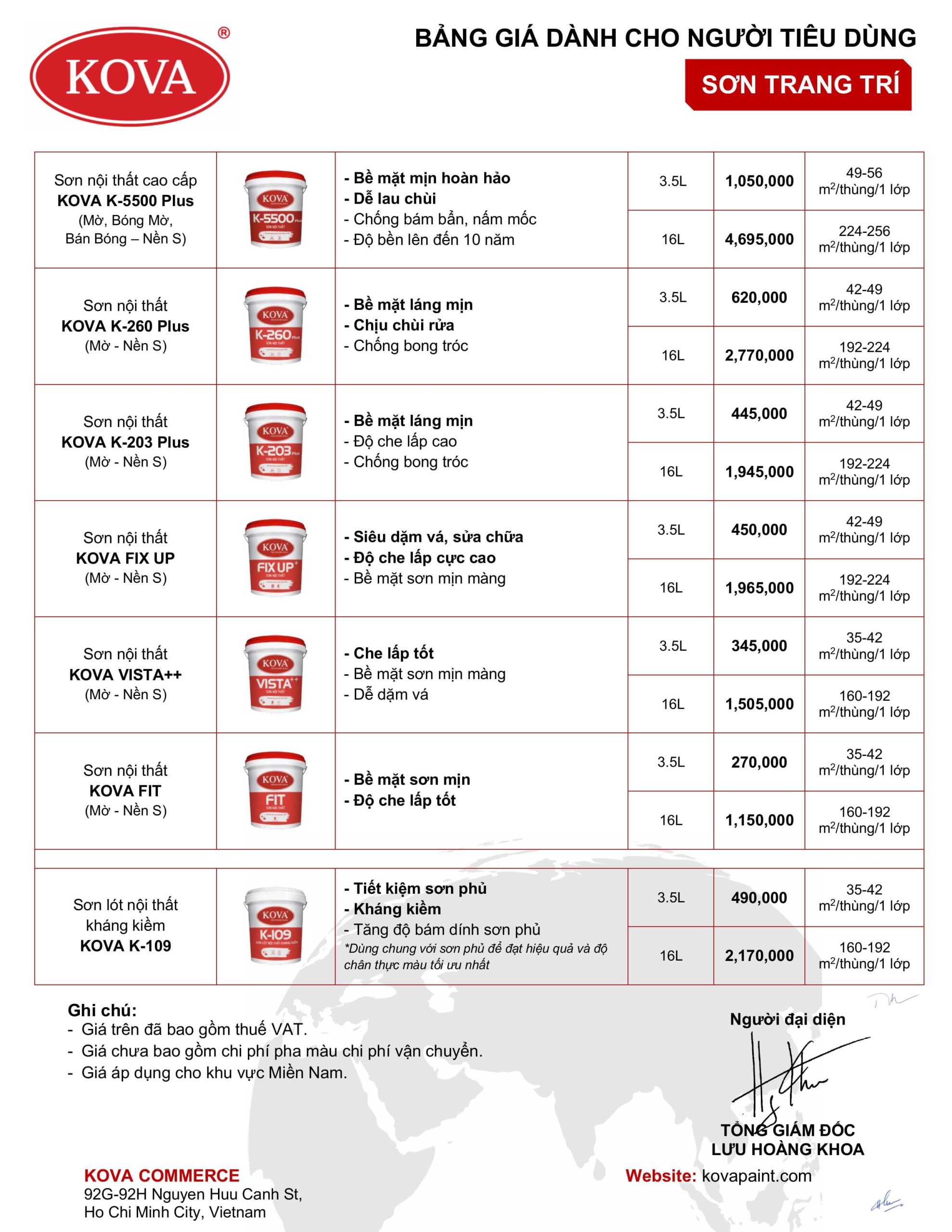 Lưu ý: Bảng giá sơn KOVA trên là từ công ty KOVA (Có hiệu lực từ 01/07/2025) và chia theo khu vực áp dụng khác nhau. Vì vậy báo giá chỉ mang tính chất tham khảo, giá sản phẩm có thể thay đổi tùy theo chiết khấu đại lý và biến động của thị trường.