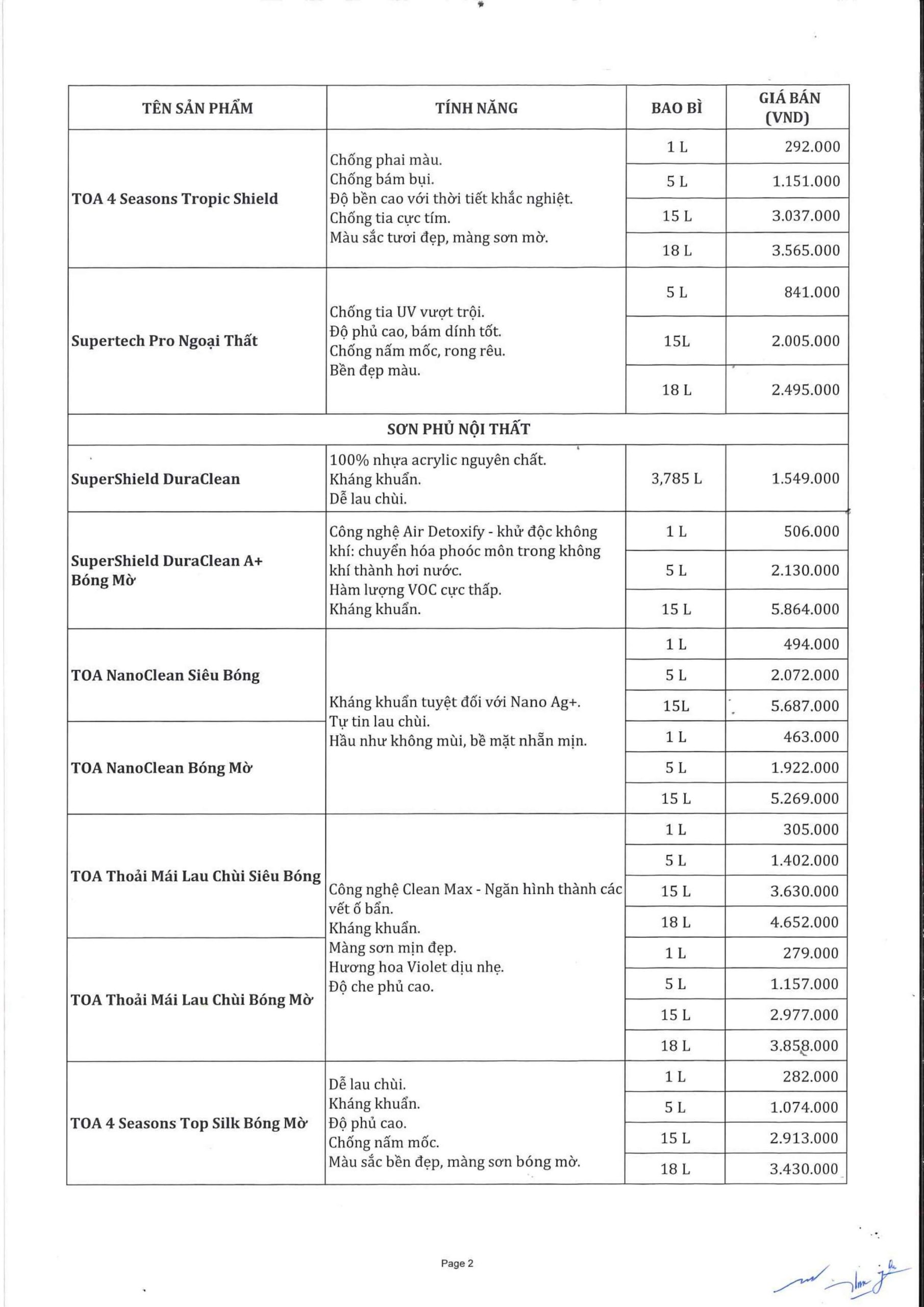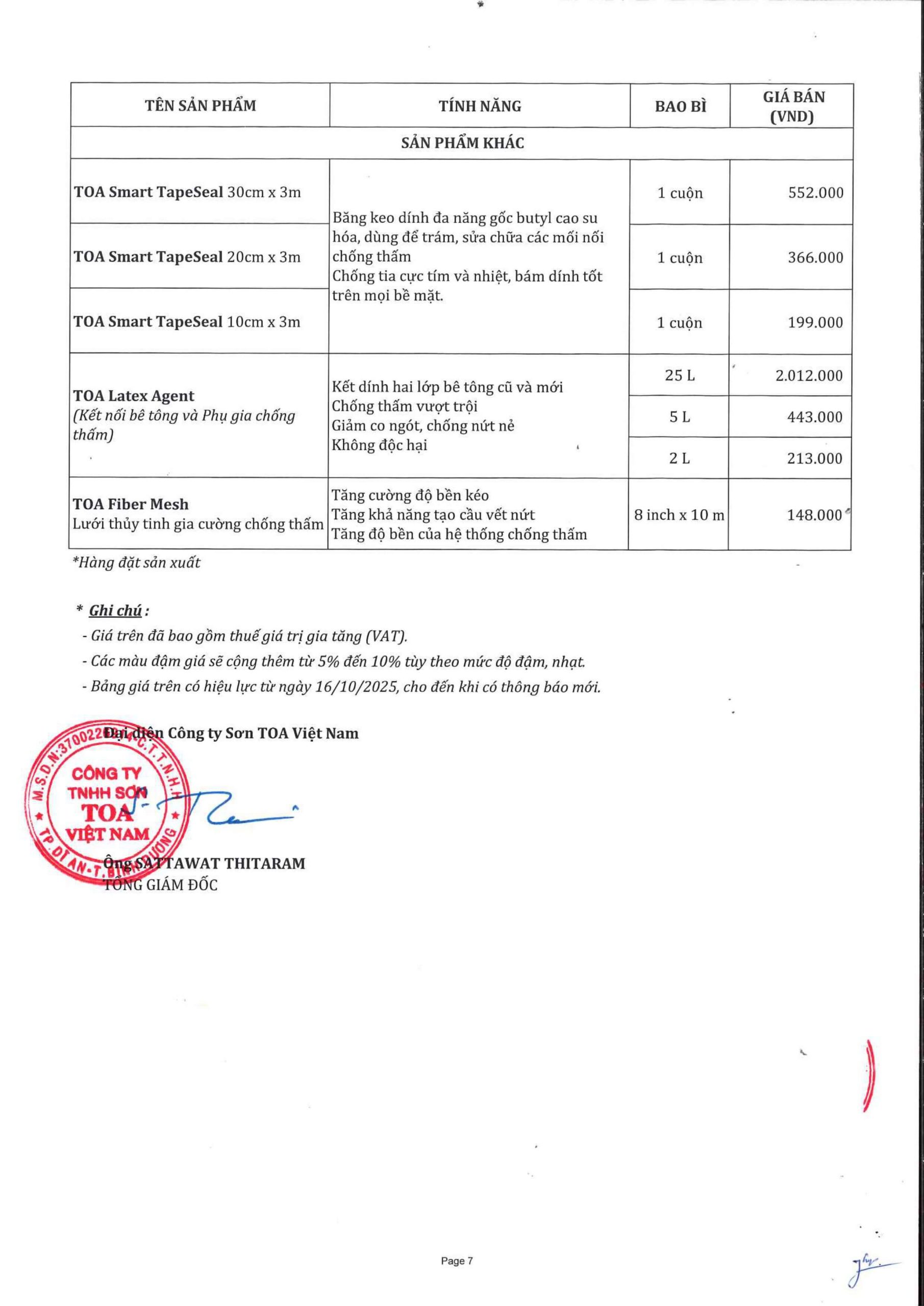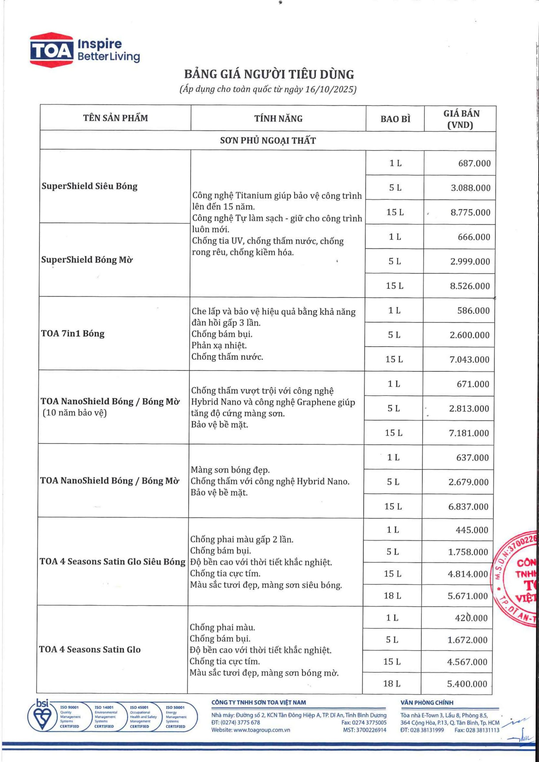 Lưu ý: Bảng giá sơn TOA trên là giá chính hãng (Có hiệu lực từ 16/10/2026) nên chỉ mang tính chất tham khảo, giá sản phẩm có thể thay đổi tùy theo đại lý và biến động của thị trường.
