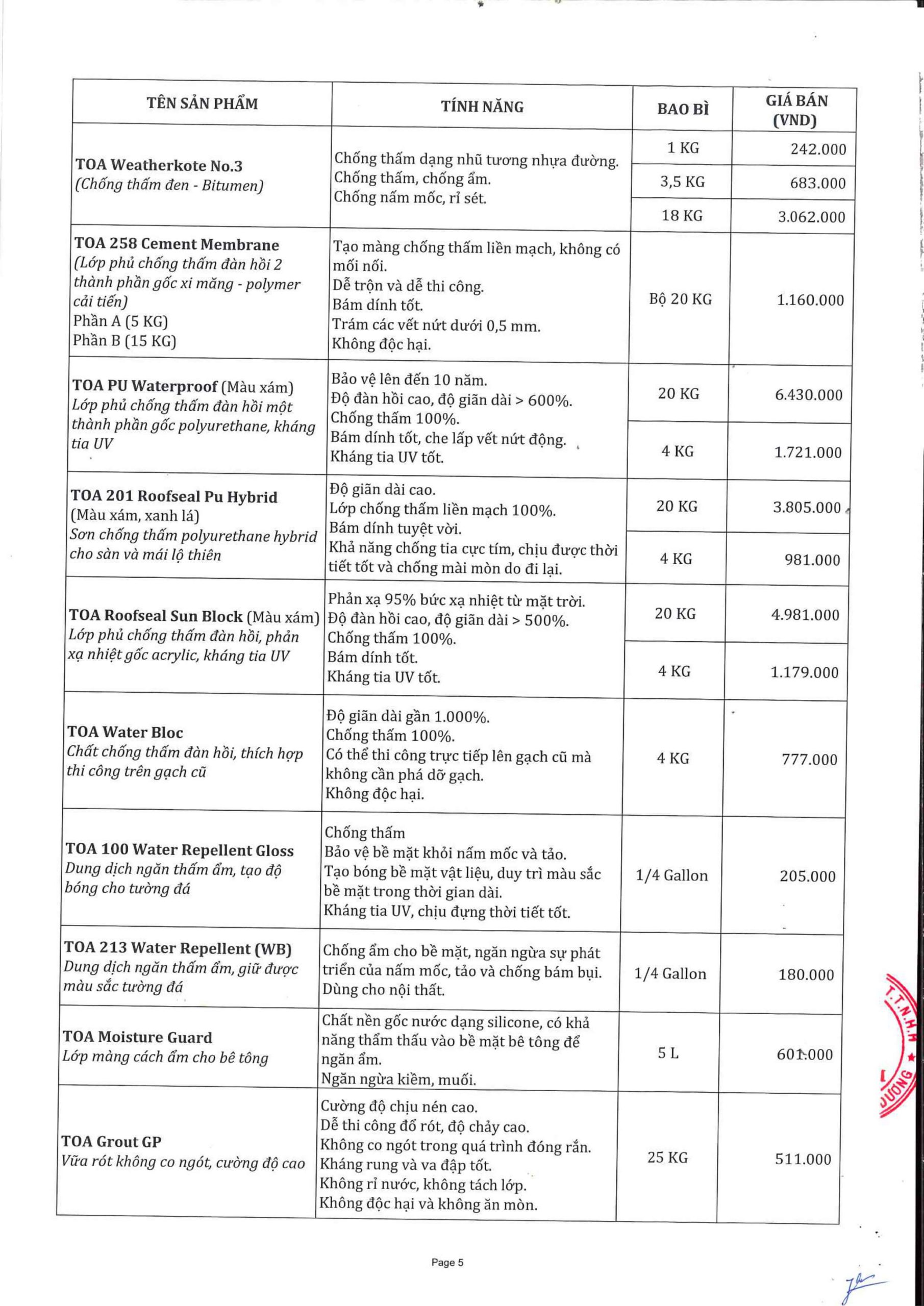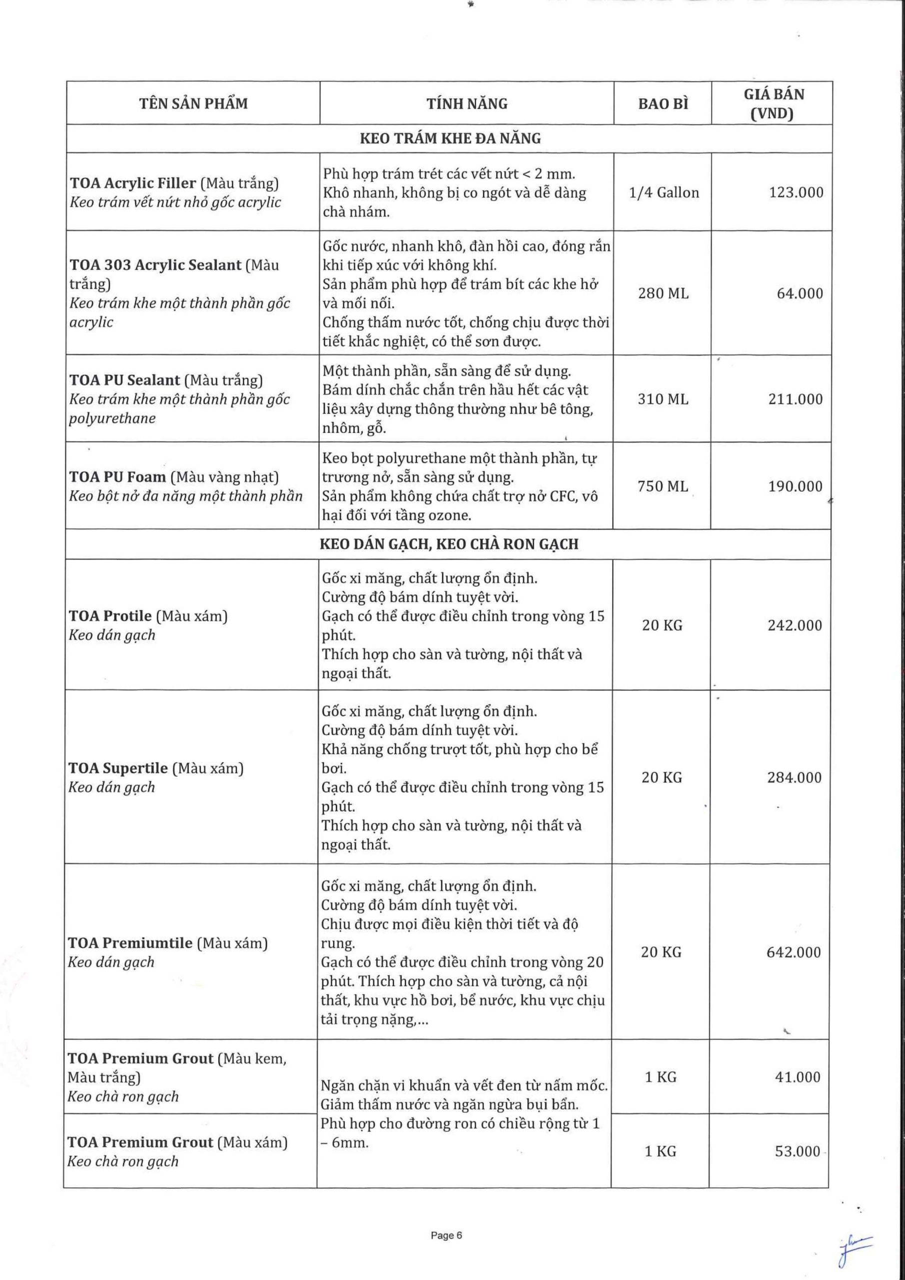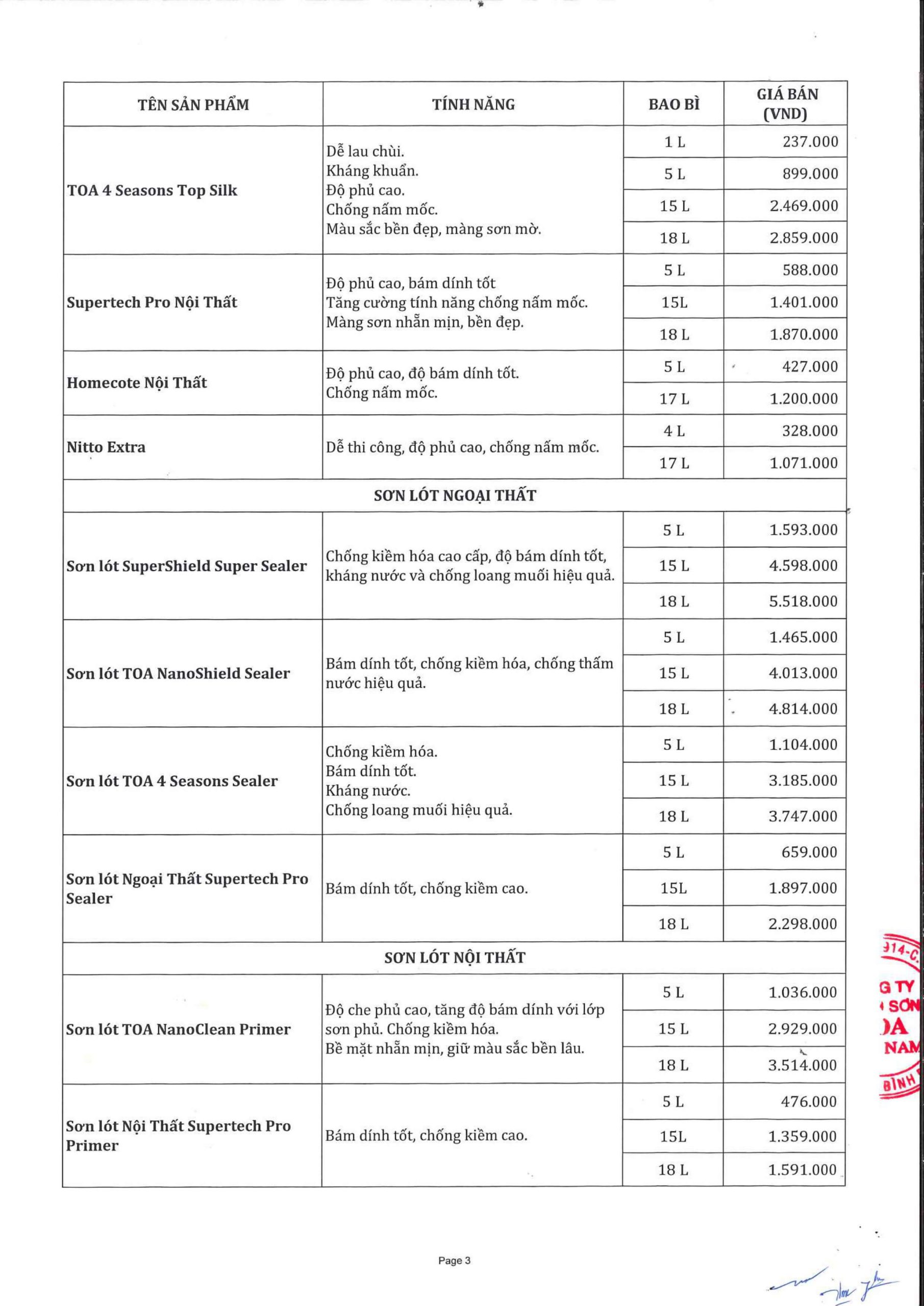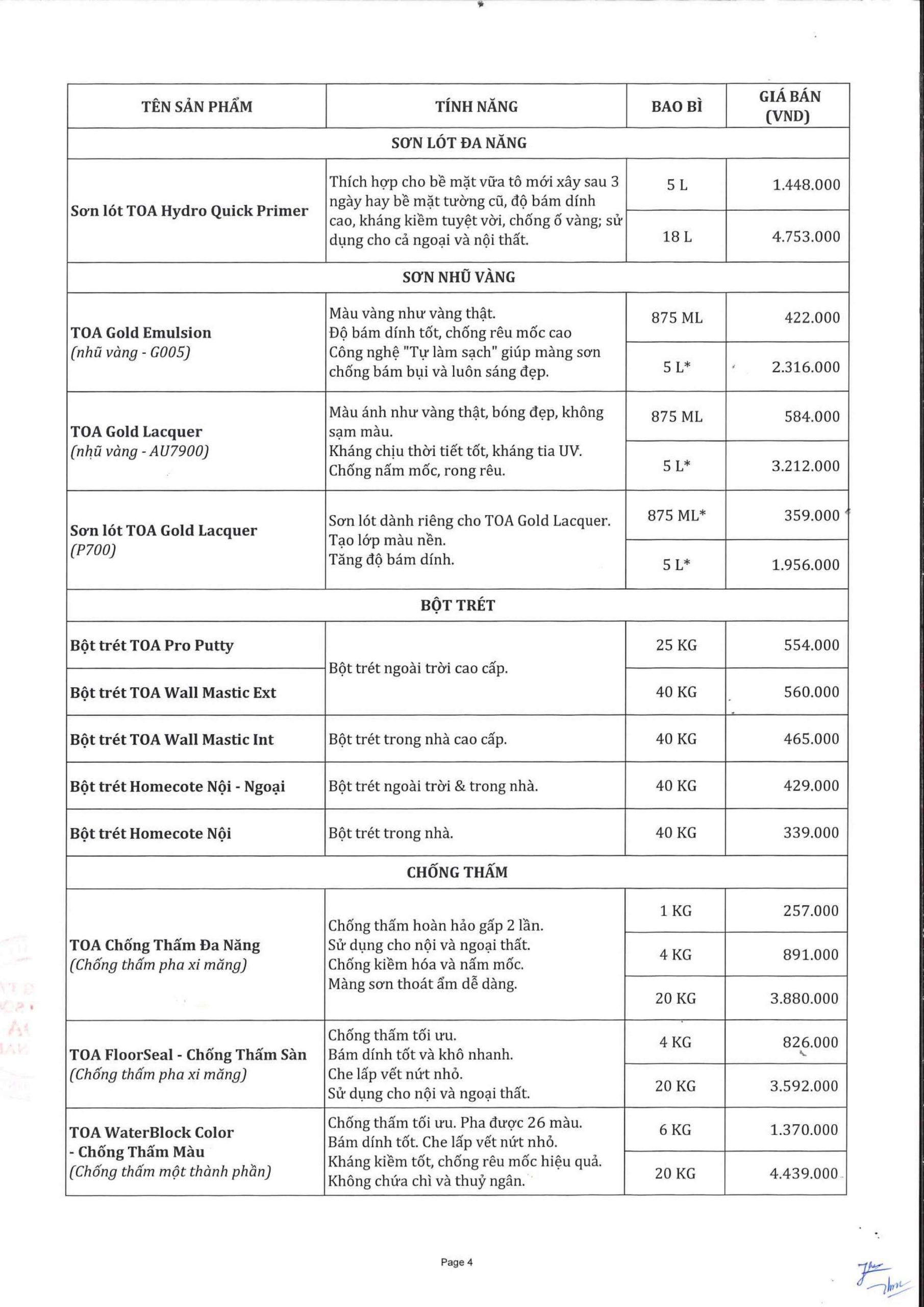 Lưu ý: Bảng giá sơn TOA trên là giá chính hãng (Có hiệu lực từ 16/10/2026) nên chỉ mang tính chất tham khảo, giá sản phẩm có thể thay đổi tùy theo đại lý và biến động của thị trường.